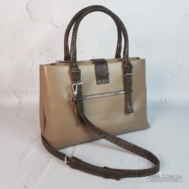 Є дві регульовані короткі ручки і довгий плечовий ремінь. На зовнішній стороні сумки є містка кишеня на блискавки.