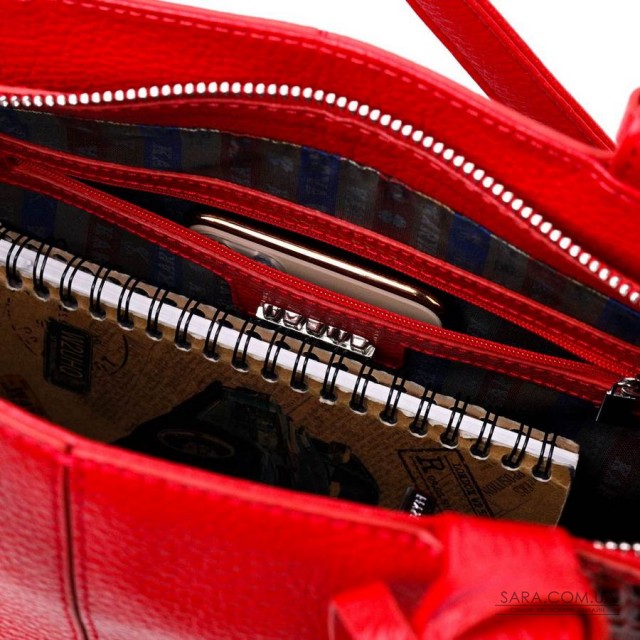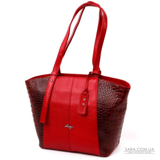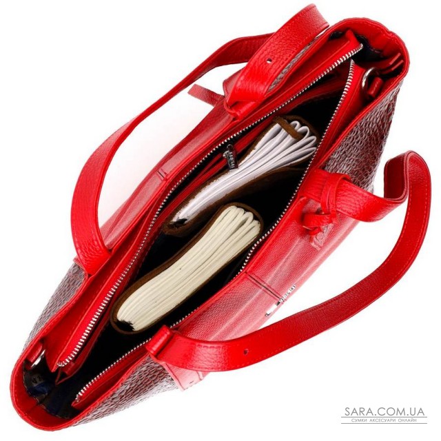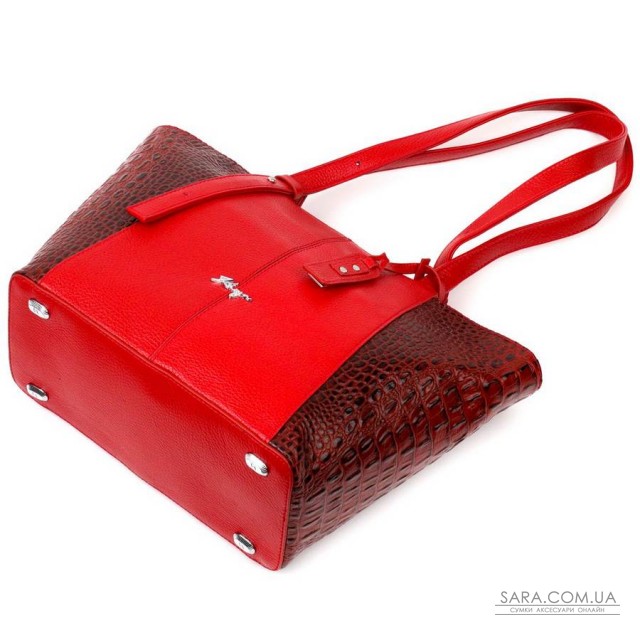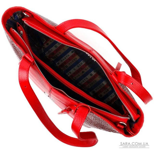 Сумка середнього розміру з натуральної шкіри з тисненням під крокодила і вставкою з зернистої шкіри, в червоному кольорі. Фурнітура срібного кольору. Сумку зручно носити в руці, на плечі або через плече. Сумка упакована у фірмовий текстильний чохол Karya. Сумка з натуральної шкіри завжди буде чудовим подарунком будь-якій жінці.