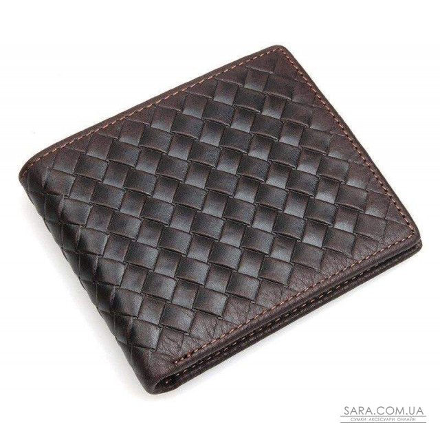 Зручне чоловіче портмоне з натуральної шкіри. Дана модель легко поміщається в передній або задній кишені джинсів. Гаманець акуратно прошитий світло-коричневою ниткою. Зовнішня сторона даної моделі має декоративний, тиснення малюнок. Гаманець упакований в текстильний пилозахисний чохол білого кольору.