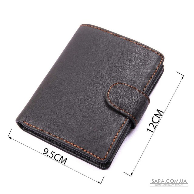 Зручний чоловічий гаманець чорного кольору. Аксесуар виконаний з натуральної високоякісної глянцевої шкіри приємної на дотик. Гаманець акуратно прошитий світло-коричневою ниткою, що надає йому оригінального виду. Колір фурнітури: латунь. Виріб упаковано в текстильний пилозахисний мішечок білого кольору.