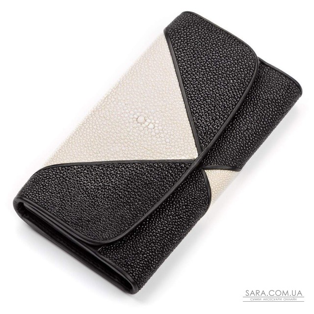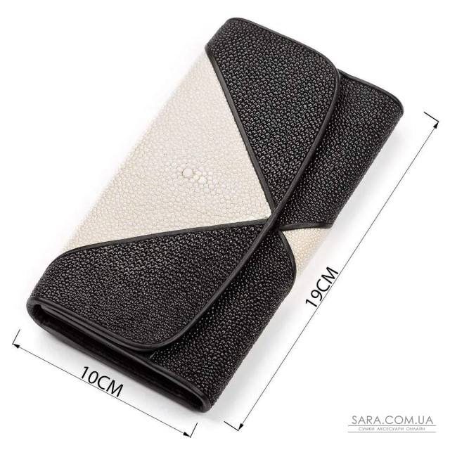 Оригінальний жіночий гаманець з натуральної шкіри морського ската, яка володіє фантастичною фактурою і красою, а також є дуже стійкою до зносу, проколів, порізів, до розривів і навіть до вогню. Весь простір шкіри покрито сотнями дрібних горбків, різного розміру, які грають на світлі, як невеликі намистинки. Аксесуар декорований, контрастними вставками з білої шкіри, що надають виробу оригінальності і яскравості. Дуже престижний аксесуар, який підійде жінці, яка цінує зручність і якість.