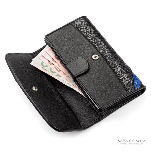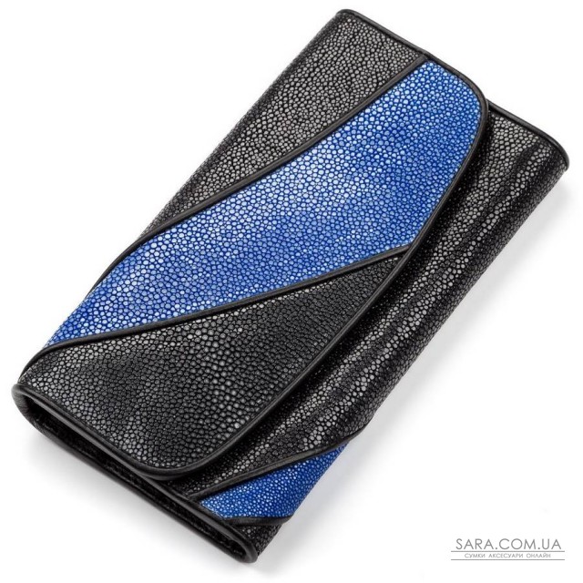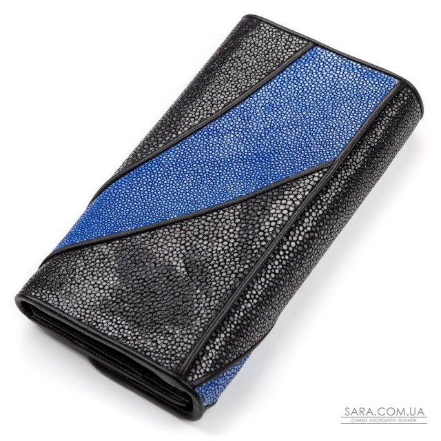 Надійний жіночий гаманець з натуральної шліфованої шкіри морського ската, яка володіє фантастичною фактурою і красою, а також є дуже стійкою до зносу, проколів, порізів, до розривів і навіть до вогню. Ввесь простір шкіри покрито сотнями дрібних горбків, різного розміру, які грають на світлі, як невеликі намистинки. Аксесуар декорований, контрастними вставками з синьої шкіри, що надають виробу оригінальності і яскравості. Дуже акуратний аксесуар, який підійде жінці, яка цінує зручність і якість.