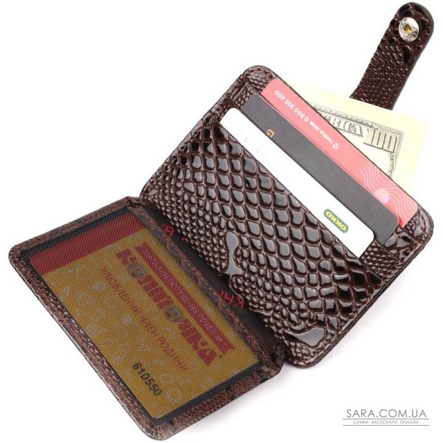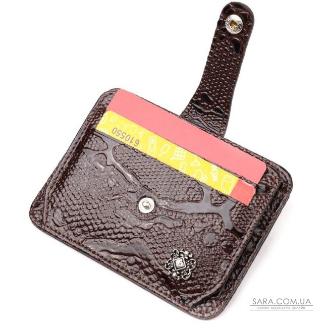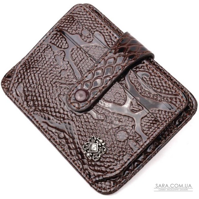 Відмінний картхолдер із лакованої шкіри з тисненням під рептилію. При закритті розворот фіксується на хлястик з кнопкою. Аксесуар упакований у фірмову коробочку. Вироби з натуральної шкіри завжди будуть чудовим подарунком для близької людини.