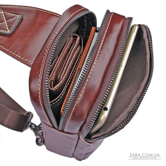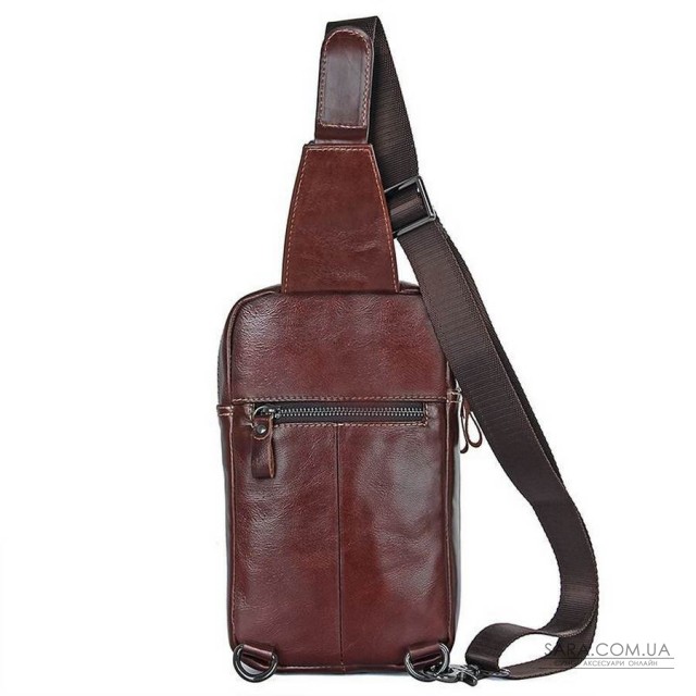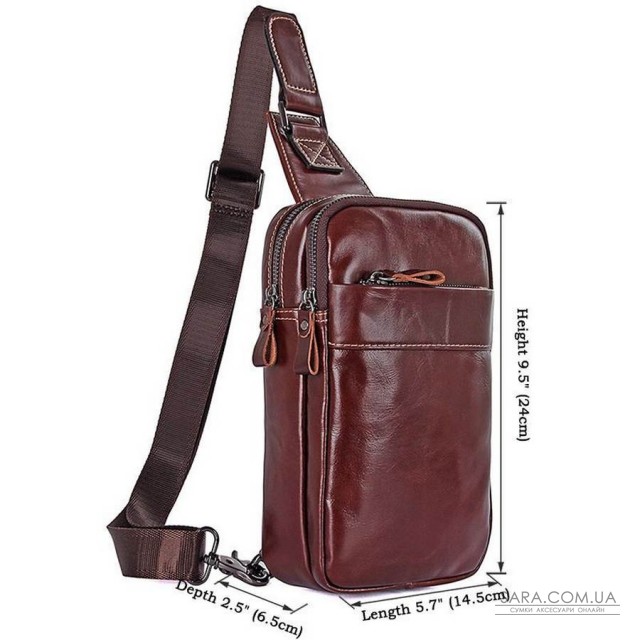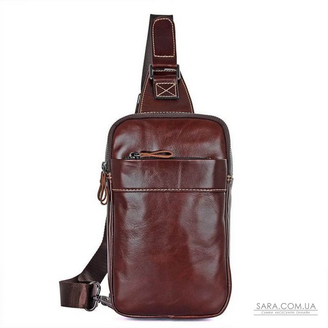 - Оригінальний дизайн, шкіряний міні-рюкзак на одній шлеї бренду John McDee виготовлений з натуральної телячої шкіри в коричневому кольорі.