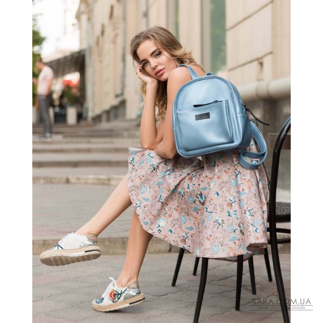 Місткий жіночий рюкзак. Модель має велике відділення з трьома кишенями, одна з яких на блискавці для портмоне або телефону, і одну містку кишеню на лицьовій стороні. Довжина лямок змінюється за допомогою металевих регуляторів. Усередині щільна плащова підкладка чорного кольору.