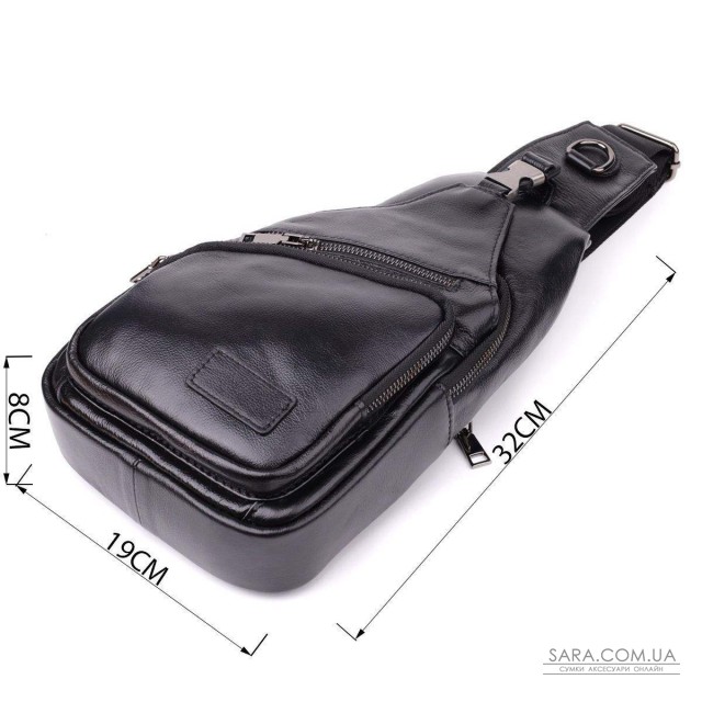 Чорна шкіряна сумка через плече поєднує у собі вишуканий зовнішній вигляд та продуману функціональність. Одне основне відділення на блискавці забезпечує безпеку та зручність зберігання речей. Усередині розташовані дві кишені — одна на блискавці для цінних дрібниць і одна відкритого типу для швидкого доступу.