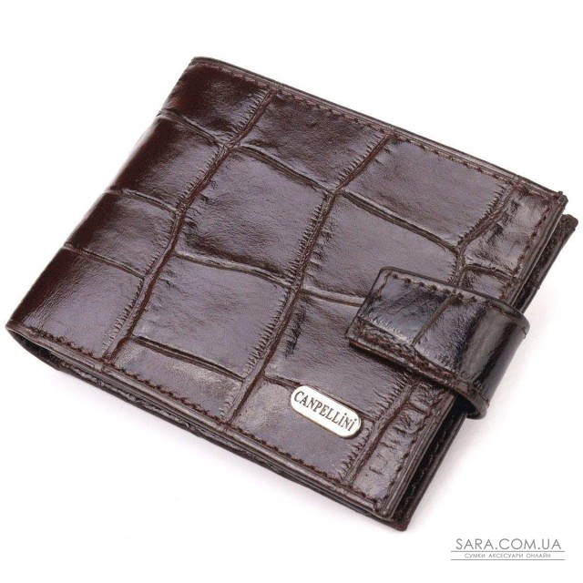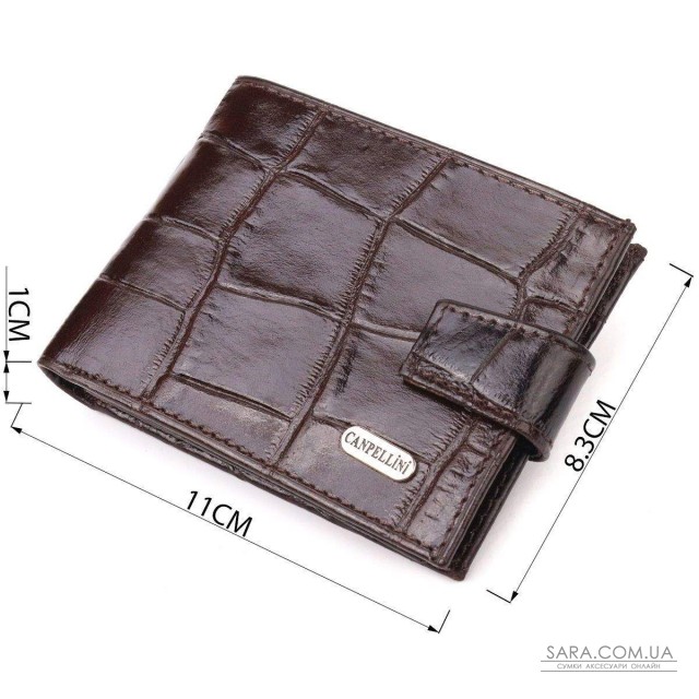 Зручне чоловіче портмоне з натуральної фактурної шкіри з тисненням під крокодила. Аксесуар має одне основне відділення з перегородкою, в якому розміщуються купюри всіх номіналів, дванадцять кишень для карток, чотири з яких під сіточкою. Закривається аксесуар хлястиком на кнопку. Колір фурнітури – срібло. Ви легко зможете помістити його в кишеню штанів чи маленьку сумку. Запакований гаманець картонну коробку. Шкіряний гаманець є чудовим подарунком для рідних та близьких людей.