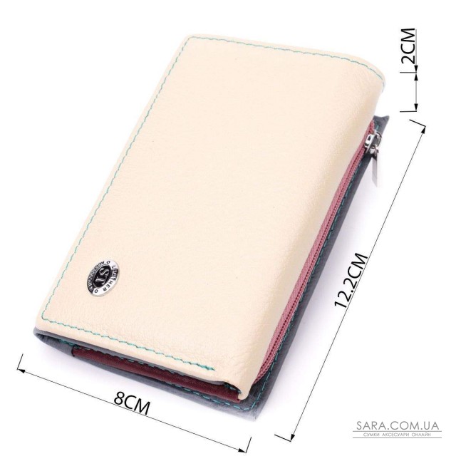 Стильне жіноче портмоне в три складання з натуральної шкіри найвищої якості. Перше, що впадає в око це колірне рішення, замість однотонного аксесуара ми маємо різнокольоровий, який містить два основні зовнішні кольори і кілька додаткових всередині. Шкіряне портмоне дуже практичне і служить досить довго. Аксесуар складається з двох містких кишень для купюр, кишені на блискавці через всю довжину, п'яти осередків для карт, прозорого віконця для пропуску та зовнішньої кишені на блискавці з перегородкою, що чудово прослужить для монет. Портмоне доповнено надійною фурнітурою. Укомплектований гаманець у фірмову картонну коробку білого кольору.