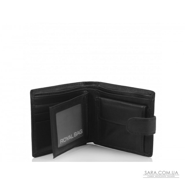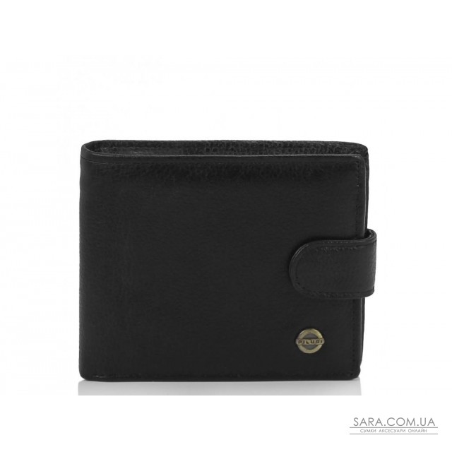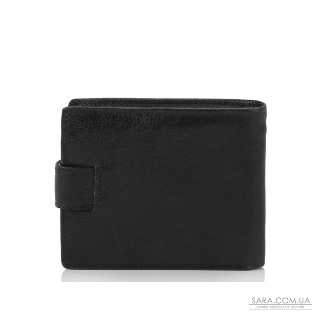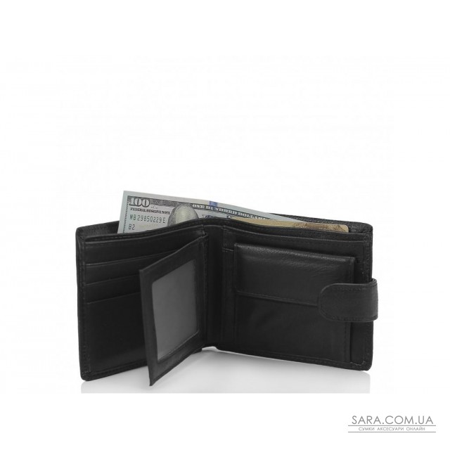 Чорний гаманець з зернистої шкіри, закривається на хлястик на кнопці. Для купюр є два відділення, а також кишеня на блискавці. Для карт і візиток є три слота, а також два прозорих віконця для прав або фото. Для монет є монетниця, яка закривається на кнопку.