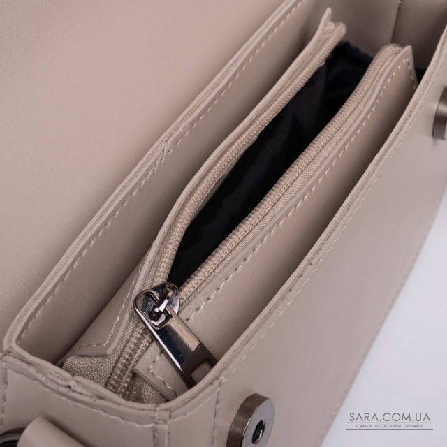 Сумка на одно общее отделение. Несмотря на небольшие размеры, сумочка оказалась достаточно вместительная. Все изделие закрывается на молнию. Длинный ремень с возможностью регулировки длины изготовлен из кожзаменителя. На задней стенке вмонтирован карман, который закрываетса на молнию.