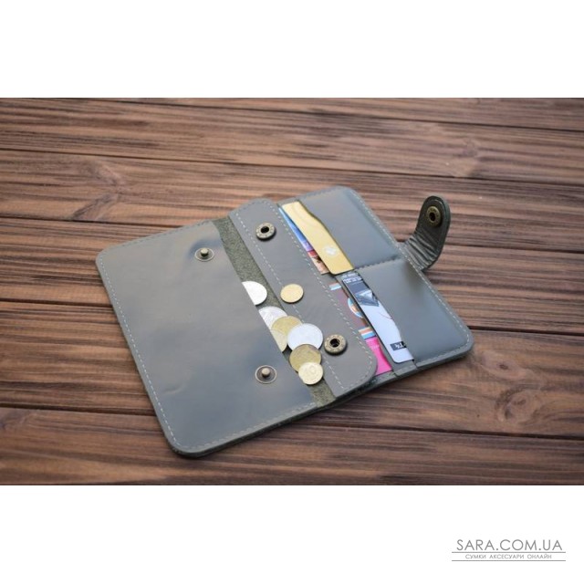 Универсальный кошелёк. Выполнен из натуральной кожи. Состоит из 2-х отделений для купюр, 4-х карманов для карточек, 1-го кармана на кнопках для монет или телефона. Закрывается на клапан с кнопкой. Размер: 19х10х1