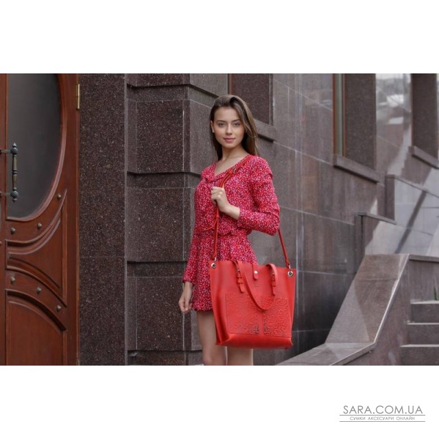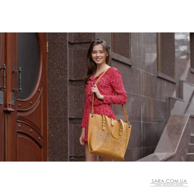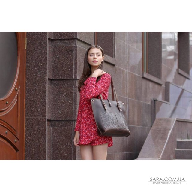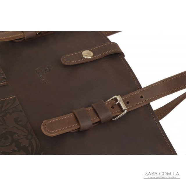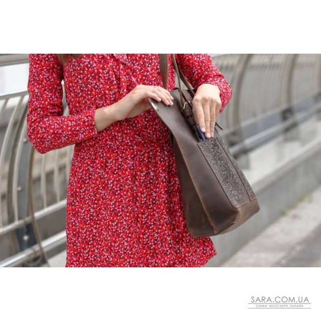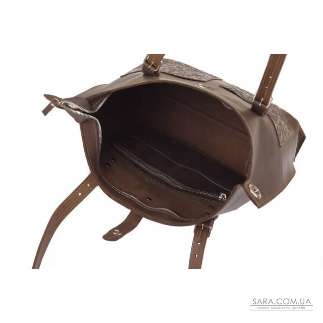 Сумка состоит из одного отделения, внутри 1 карман на молнии (под смартфон или кошелёк) и 2 открытых кармана для мелочей. На передней стенке размещены два нашивных кармана с тиснением "Растительный орнамент". Сумка фиксируется клапаном на кнопке. Предусмотрен съёмный плечевой ремень и две ручки, регулируются на нужною длинну . Возможно монтирование молнии на основное отделение (дополнительно + 100 гривен). Размер: 43/33х36х11