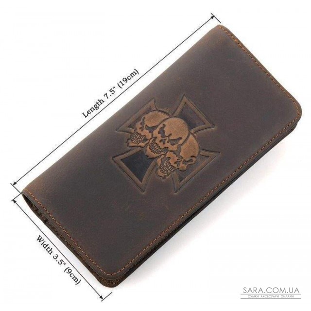 Современный кожаный купюрник с оригинальным рисунком на лицевой стороне. Кошелек аккуратно прошит сверх-прочной нитью коричневого цвета. Данный аксессуар удобно держать в руке, но из-за своих размеров он не полностью помещается в карман джинсов. Кошелек упакован в текстильный пылезащитный мешочек.