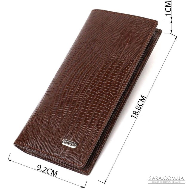 Отличный мужской кошелек из натуральной кожи с тиснением под рептилию. Аксессуар имеет одно основное отделение для купюр всех номиналов, одиннадцать ячеек для карточек, карман под сеточкой для пропуска, два скрытых кармана и монетницу на молнии. Закрывается аксессуар пополам без застежки. На лицевой стороне, в правом нижнем углу металлический логотип компании производителя. Приобретая кожаный аксессуар этой фирмы, себе или на подарок, будьте уверены, что он прослужит Вам не один год.