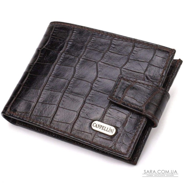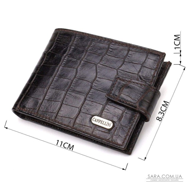 Модный мужской кошелек, из натуральной фактурной кожи, с тиснением под крокодила. Аксессуар имеет одно основное отделение с перегородкой, в которое помещаются купюры всех номиналов, девять карманов для карточек, два из которых под сеточкой, монетница и два прилегающих кармана. Закрывается аксессуар хлястиком на кнопку. Цвет фурнитуры – серебро. Вы легко сможете поместить его в карман брюк или маленькую сумку. Упакован бумажник картонную коробку. Кожаный кошелек является отменным подарком для родных и близких людей.