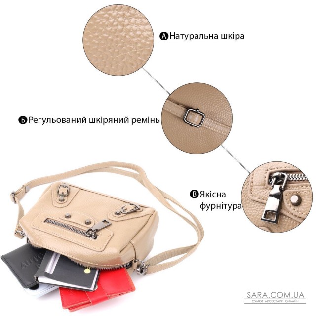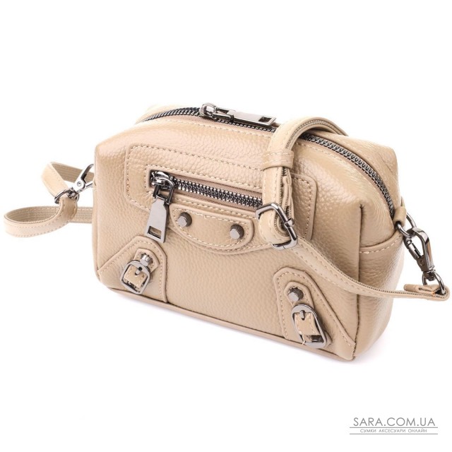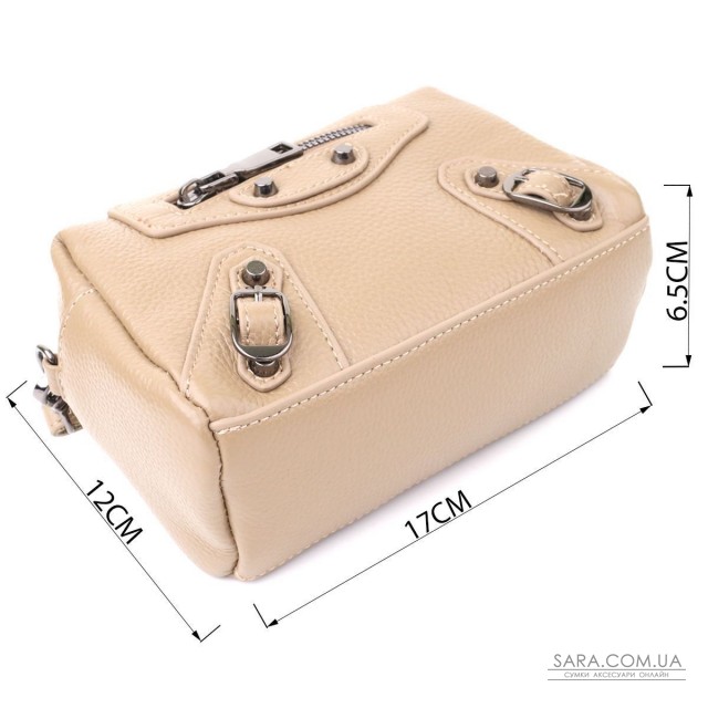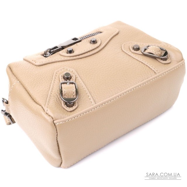 Компактная женская кожаная сумка в бежевом цвете с декоративной фурнитурой — эффектный акцент с характером. Сумка выполнена из натуральной кожи в стильном бежевом цвете, который делает образ светлым, свежим и актуальным. Декоративные элементы играют ключевую роль в дизайне: металлические заклепки, ремешки и фигурная строчка на лицевой стороне придают аксессуару современный, слегка дерзкий вид.