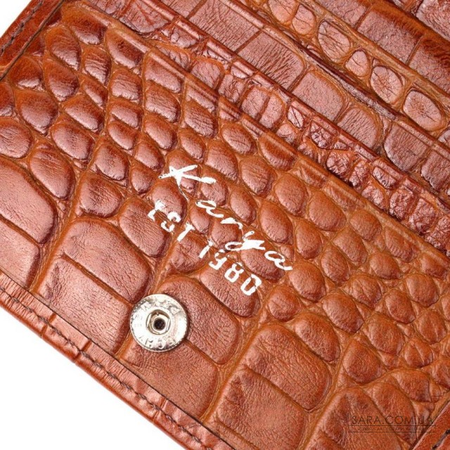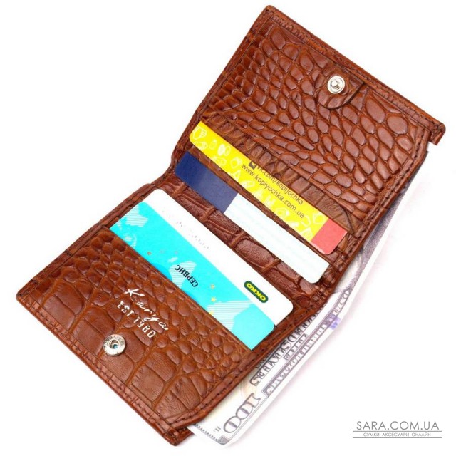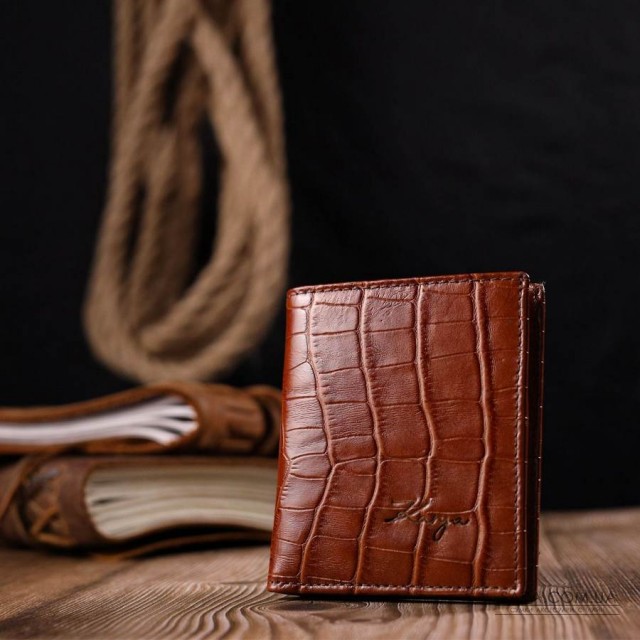 Компактный мужской кошелек из натуральной кожи с тиснением под рептилию, в коричневом цвете. Изделия закрывается на кнопку. Аксессуар упакован в фирменную коробочку. Изделия из натуральной кожи всегда будут отличным подарком для близкого человека.