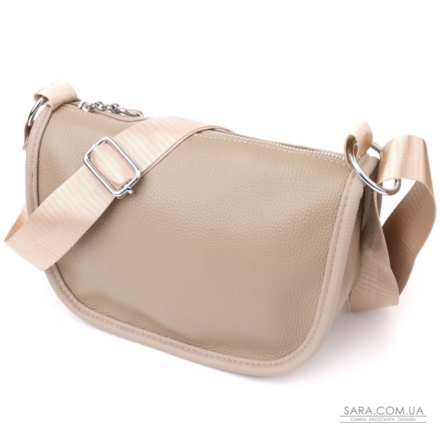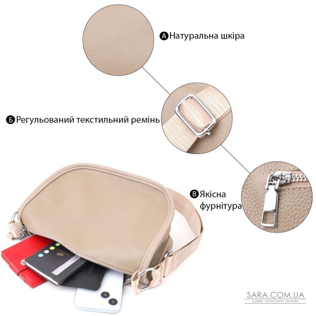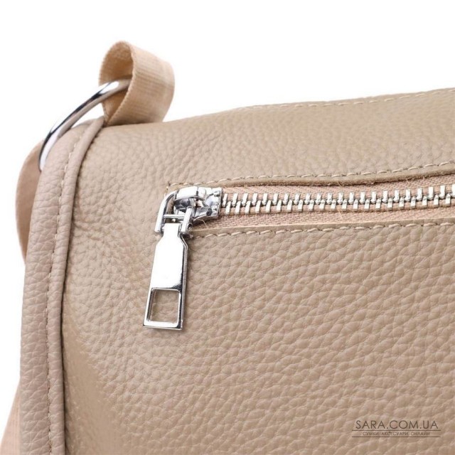 Женская кожаная сумка в бежевом цвете выполнена из качественной зернистой кожи и имеет полукруглую аккуратную форму, которая подчеркивает утонченность и современный стиль. Особое внимание привлекает декоративный бегунок в виде элегантного брелка, придающий модели индивидуальность и шарм. Сумка закрывается на молнию, внутри расположено основное отделение с двумя карманами на молнии и двумя открытыми карманами для мелких предметов, а на тыльной стороне есть внешний карман на молнии. Несъемный текстильный ремень обеспечивает удобство при носке, а фурнитура под серебро гармонично оттеняет теплый бежевый цвет кожи. Эта сумка станет стильным и практичным аксессуаром как для повседневных образов, так и для особых случаев.