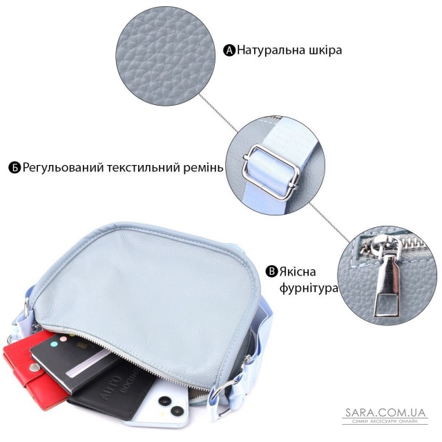 Женская кожаная сумка в серо-голубом цвете выполнена из качественной зернистой кожи и имеет полукруглую аккуратную форму, подчеркивающую современный и элегантный стиль. Особый акцент модели — декоративный бегунок в виде стильного брелка, который добавляет индивидуальности и изысканности. Сумка закрывается на молнию, внутри расположено основное отделение с двумя карманами на молнии и двумя открытыми карманами для мелочей, на тыльной стороне есть внешний карман на молнии. Несъемный текстильный ремень обеспечивает комфортное ношение, а фурнитура под серебро гармонично оттеняет холодный серо-голубой тон кожи. Эта сумка станет универсальным аксессуаром для повседневного использования и особых случаев, сочетая практичность и стиль.