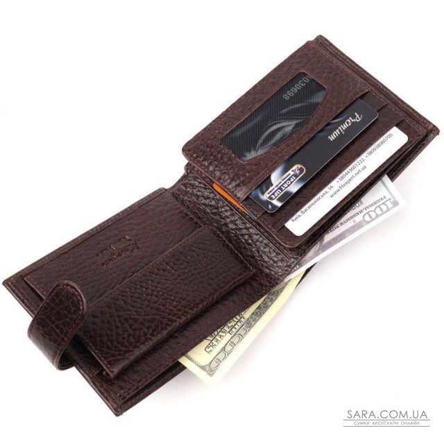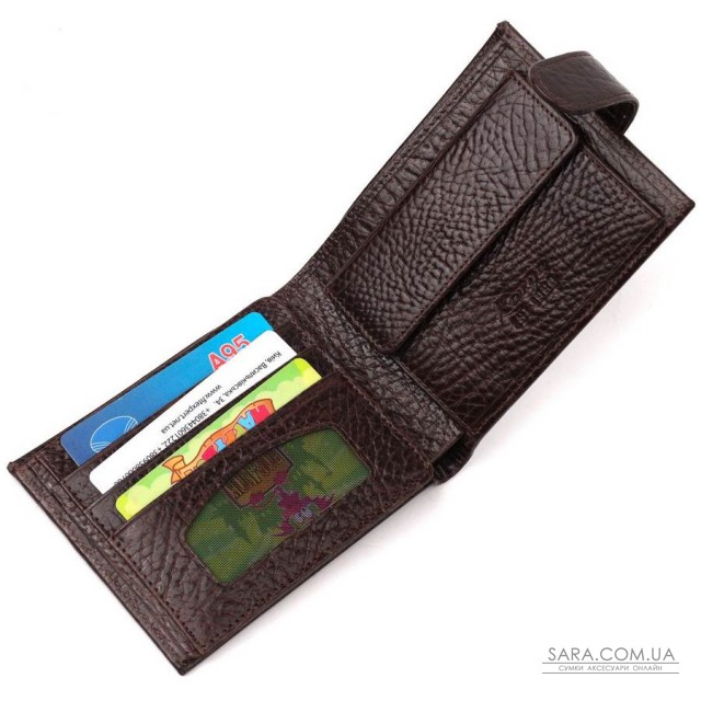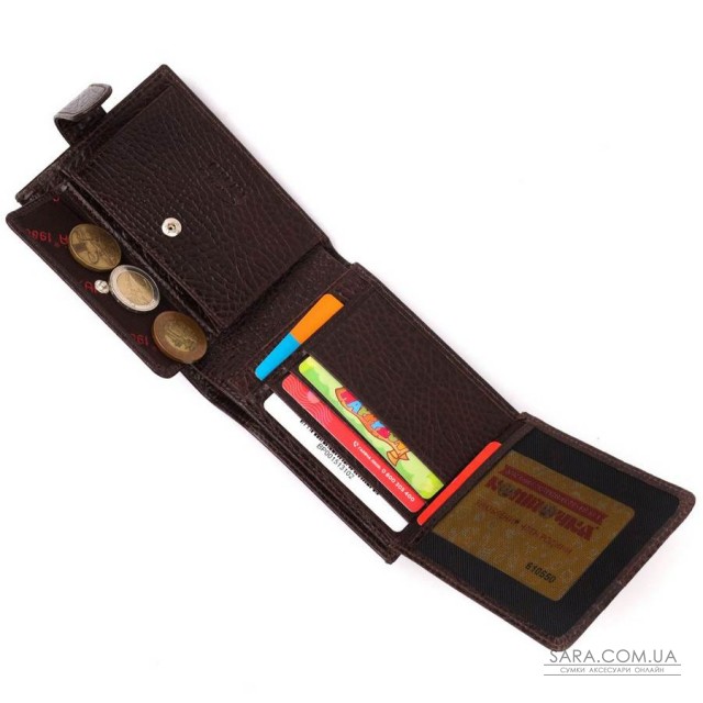 Функциональный мужской кошелек из натуральной кожи, в коричневом цвете. Изделие закрывается хлястиком на кнопку. Изделие имеет вместительные отделения для купюр и внутри достаточно ячеек для кредиток. Изделие упаковано в фирменную коробочку. Изделия из натуральной кожи всегда будут отличным подарком для близкого человека.