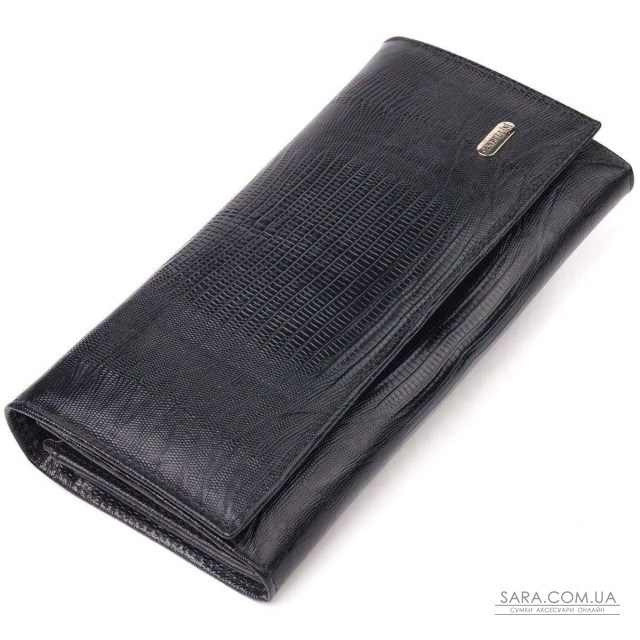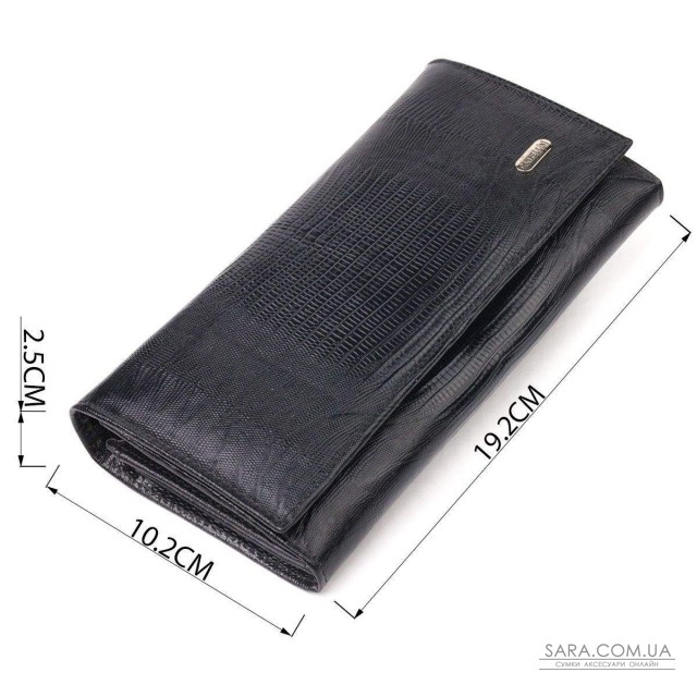 Вместительный горизонтальный женский кошелек, из фактурной натуральной кожи, с тиснением под рептилию. Аксессуар имеет три больших кармана для купюр, три прилегающих кармана, восемь ячеек для карточек, три из них под сеточкой, монетницу на молнии. Изделие закрывается клапаном на кнопку. Отличная идея для подарка, которая не оставит равнодушной ни одну женщину.
