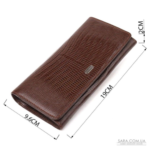 Стильный фактурный женский кошелек, из натуральной кожи, с тиснением под рептилию. Аксессуар имеет три основных отделения, в которые помещаются купюры всех номиналов, две перегородки, одна из них на молнии, одиннадцать карманов для карточек, один из которых под сеточкой, монетница на молнии - снаружи и один прилегающий карман. Закрывается аксессуар клапаном на кнопку. Отличный аксессуар, надежного производителя, который прослужит очень долго.