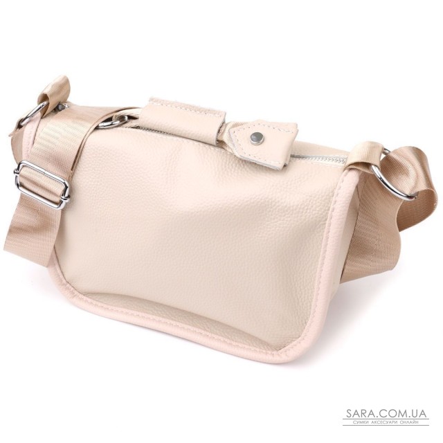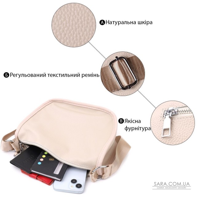 Женская кожаная сумка в нежном белом цвете выполнена из качественной зернистой кожи и имеет полукруглую аккуратную форму, подчеркивающую элегантность и легкость образа. Декоративный бегунок в виде стильного брелка придает модели индивидуальность и утонченный шарм. Сумка закрывается на молнию, внутри расположено основное отделение с двумя карманами на молнии и двумя открытыми карманами для мелочей, на тыльной стороне есть внешний карман на молнии. Несъемный текстильный ремень обеспечивает удобство при носке, а фурнитура под серебро гармонично оттеняет светлый белый тон кожи. Эта сумка станет универсальным аксессуаром как для повседневных выходов, так и для особых случаев, сочетая практичность, стиль и внимание к деталям.