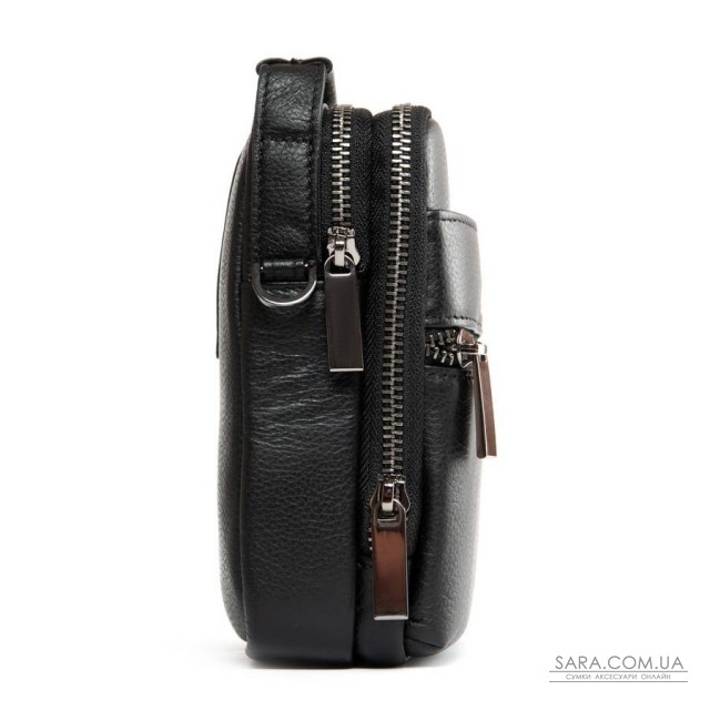 Изготовлена из мягкой натуральной кожи. Два отделения, закрываются на молнию. На фасаде расположен один карман на молнии и один открытый карман.
