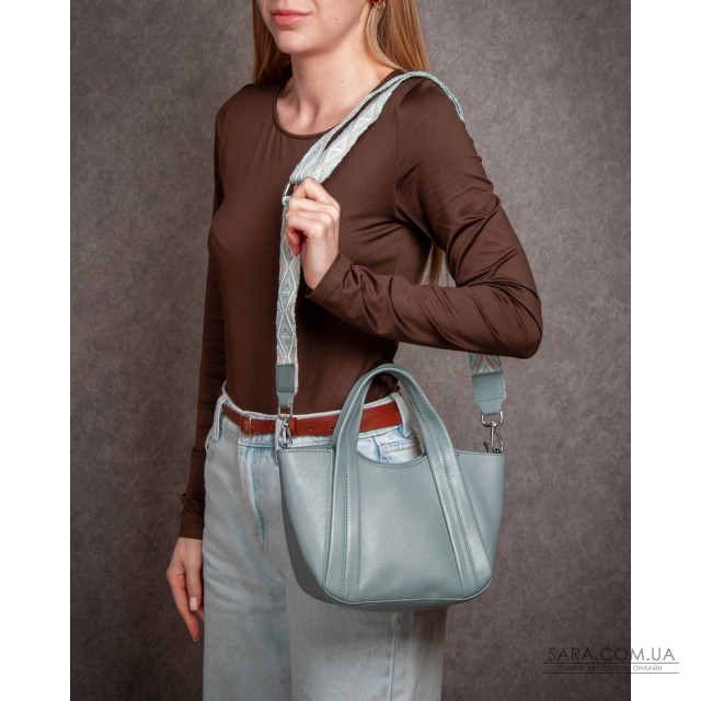Фасад и обратная сторона сумки одинаковые. Закрывается на молнию. Внутри находится одно отделение, боковой открытый карман и карман на молнии.