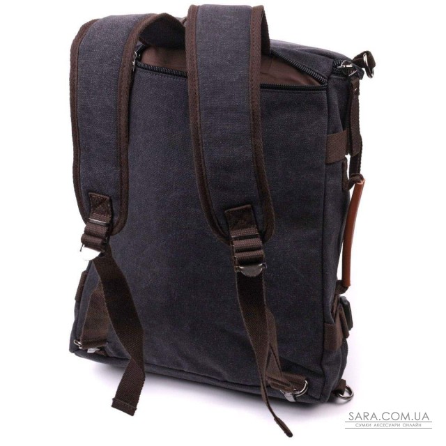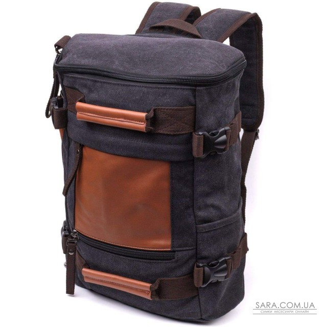 Многофункциональный рюкзак трансформер черного цвета из плотного текстиля. Рюкзак очень вместительный. На лицевой стороне рюкзак имеет несколько ручек для носки в руках. Изделие имеет очень практичный функционал. Рюкзак подойдет для путешествий и командировок. Внутри рюкзака есть уплотненный карман для ноутбука. Несмотря на свой большой размер рюкзак не тяжелый. Закрывается рюкзак на молнию. Внутри - качественная подкладка.