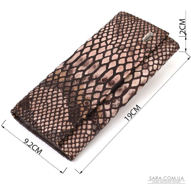 Стильный женский кошелек, из натуральной кожи с тиснением под змею. Аксессуар имеет два широких основных отделения, в которые помещаются купюры всех номиналов, карман перегородка на молнии, монетница, десять карманов для карточек, два прилегающих кармана и один скрытий карман. Закрывается аксессуар на клапаном на кнопку. Если Вы хотите порадовать и себя и удивить близких, то непеременно покупайте кожаные аксессуары в нашем магазине, качество и цена Вас однозначно порадует.