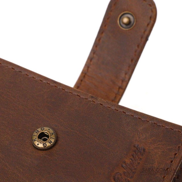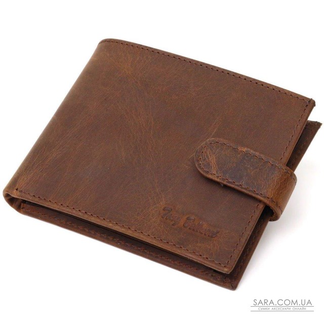 Превосходный кошелек для мужчин из натуральной винтажной кожи. Аксессуар состоит из двух вместительных отделений для купюр, трех ячеек для пластиковых карт, двух карманов под сеточкой, для документов, двух прилегающих карманов и монетницы. В изделии использована качественная фурнитура. Закрывается кошелек хлястиком на кнопку.