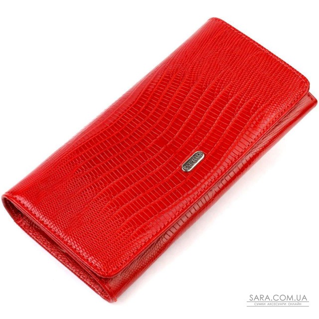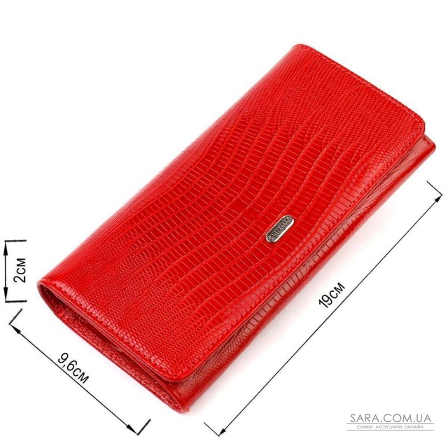 Яркий фактурный женский кошелек, из натуральной кожи, с тиснением под рептилию. Аксессуар имеет три основных отделения, в которые помещаются купюры всех номиналов, две перегородки, одна из них на молнии, одиннадцать карманов для карточек, один из которых под сеточкой, монетница на молнии снаружи и один прилегающий карман. Закрывается аксессуар клапаном на кнопку. Отличный аксессуар, надежного производителя, который прослужит очень долго.