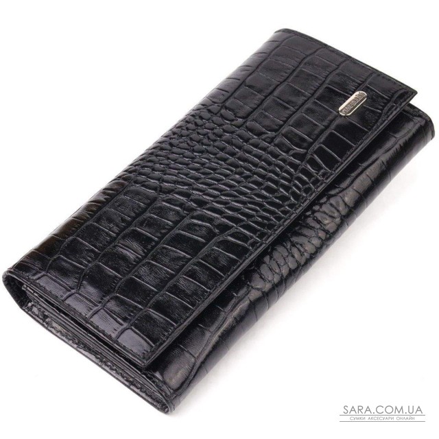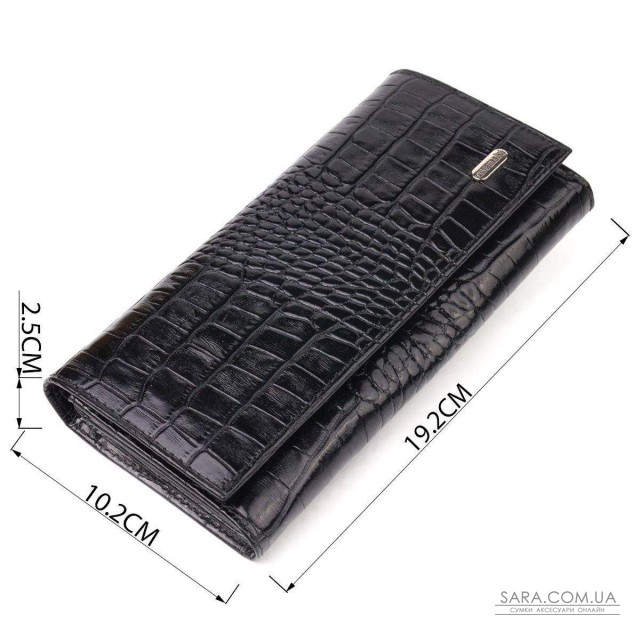 Практичный горизонтальный женский кошелек, из фактурной натуральной кожи, с тиснением под крокодила. Аксессуар имеет три больших кармана для купюр, три прилегающих кармана, восемь ячеек для карточек, три из них под сеточкой, монетницу на молнии. Изделие закрывается клапаном на кнопку. Отличная идея для подарка, которая не оставит равнодушной ни одну женщину.