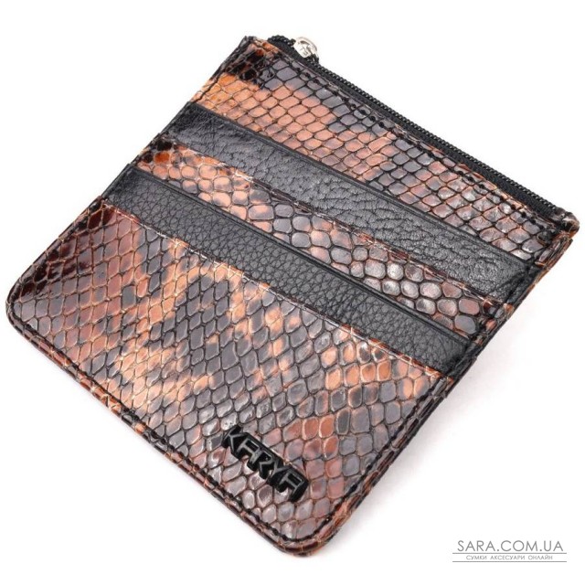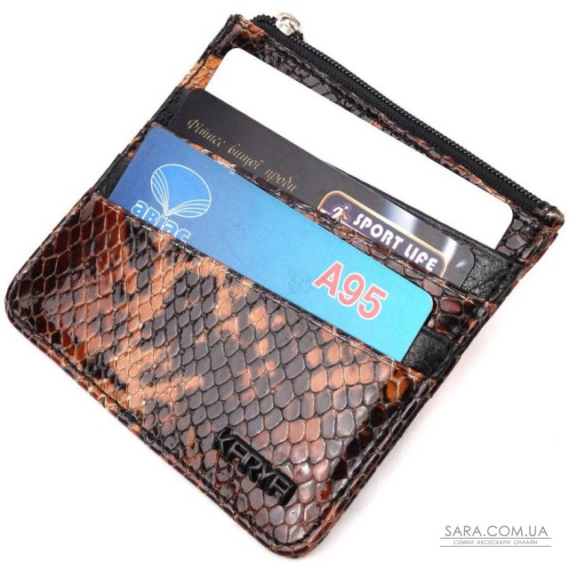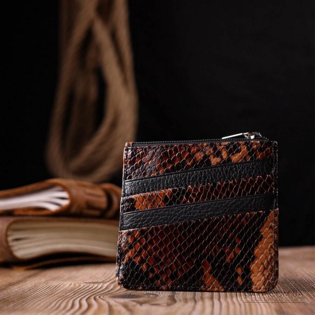 Гарний картхолдер із комбінації двох видів натуральної шкіри, зернистої та з тисненням під змію. Аксесуар упакований у фірмову коробочку. Вироби з натуральної шкіри завжди будуть чудовим подарунком для близької людини.