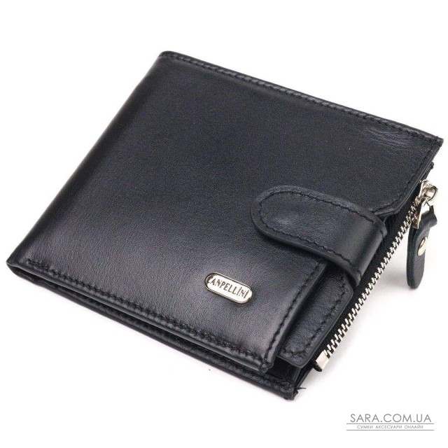 Стильне чоловіче портмоне з натуральної гладкої шкіри. Аксесуар має одне основне відділення з перегородкою, до якого вміщуються купюри всіх номіналів, дев'ять кишень для карток, дві з яких під сіточкою, монетницю на блискавці, п'ять прилеглих кишень, а також автономний блок для карт, який розташований в одній із прилеглих кишень. Закривається аксесуар хлястиком на кнопку. Колір фурнітури – срібло. Шкіряний гаманець є чудовим подарунком для рідних та близьких людей.
