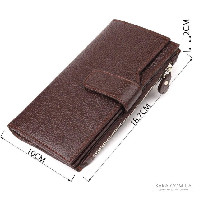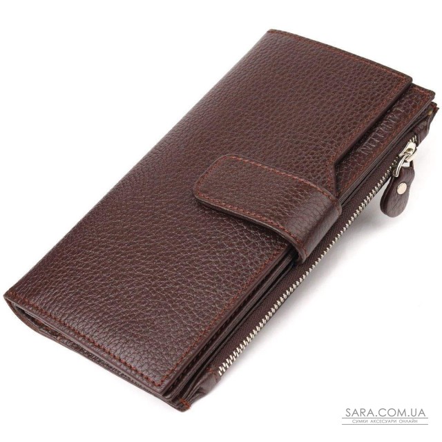 Сучасний жіночий гаманець з натуральної шкіри. Аксесуар має шість прилеглих кишень, у які помістяться купюри всіх номіналів, містку монетницю та двадцять кишень для карток. Закривається аксесуар хлястиком на кнопку. Якщо Ви хочете порадувати себе та здивувати близьких, то неодмінно купуйте шкіряні аксесуари в нашому магазині, якість і ціна Вас однозначно порадує.