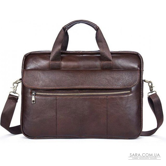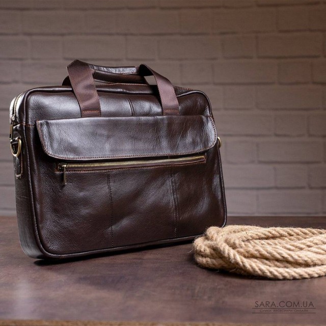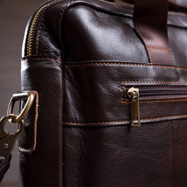 Солідна сумка для зустрічей, щоб носити з собою ноутбук і документи. Аксесуар доповнено золотистою фурнітурою і прошитий рудою ниткою. Модель можна носити як за ручки з шкіряними вставками, так і за допомогою текстильного ремінця на плече. Усередині міцна текстильна підкладка коричневого кольору. У догляді модель не примхлива і довго носиться. Буде ідеальним варіантом для подарунка близькій людині. Аксесуар упакований в тканинний мішок.