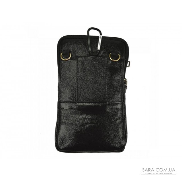 Компактна поясна сумка з натуральної шкіри чорного кольору. Для носіння додатково можна застосувати плечовий ремінь. Два відділення закриваються на блискавку. З лицьового боку є три кишені, що закриваються на блискавку.