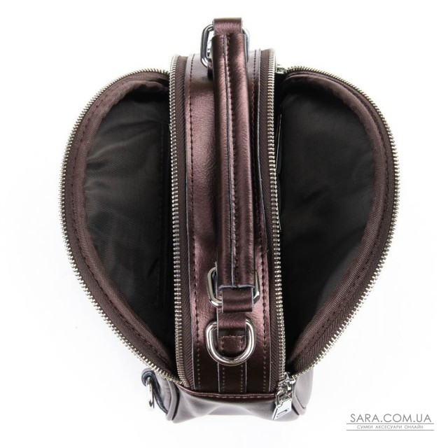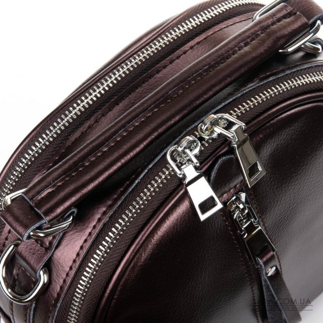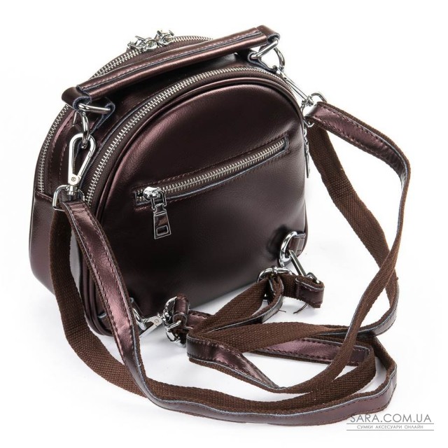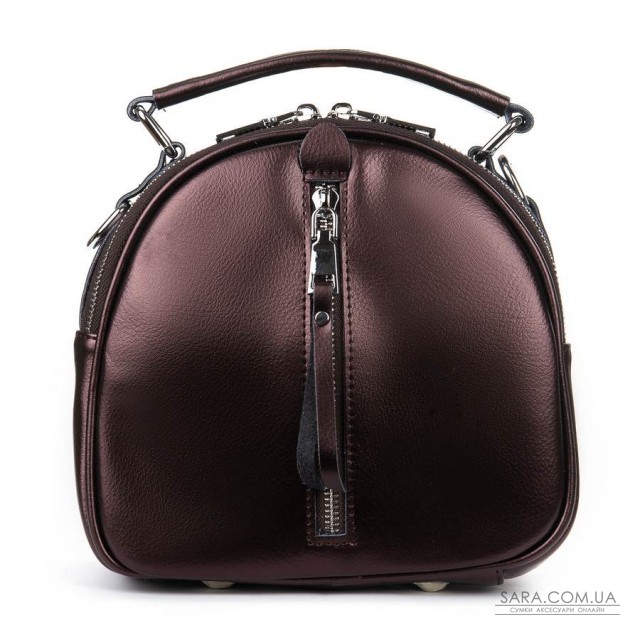 Жіноча шкіряна сумочка-рюкзак. Виготовлена із натуральної щільної шкіри. Можна носити як рюкзак або на плечі на регульованому ремені. Два відділення, закриваються на блискавку. Усередині відділень є подвійний відкритий кишеню і кишеню на блискавки. На фасаді і зворотному боці знаходяться кишені на блискавці. Плечові лямки регулюються по довжині.