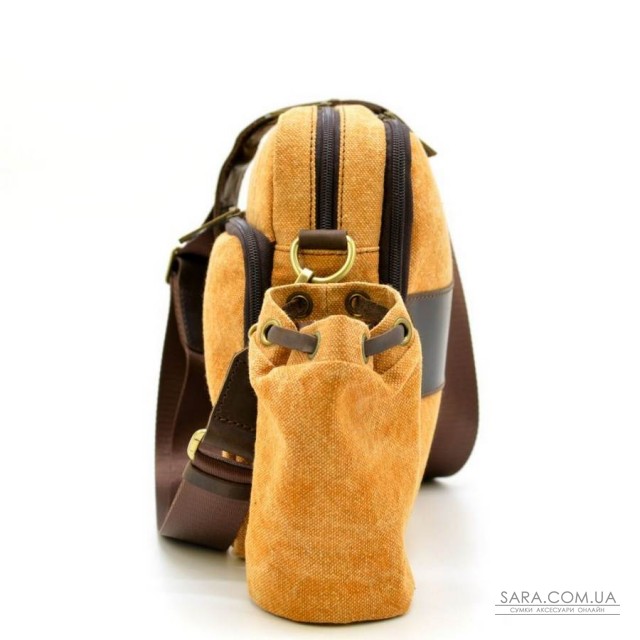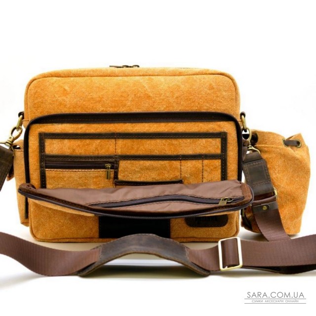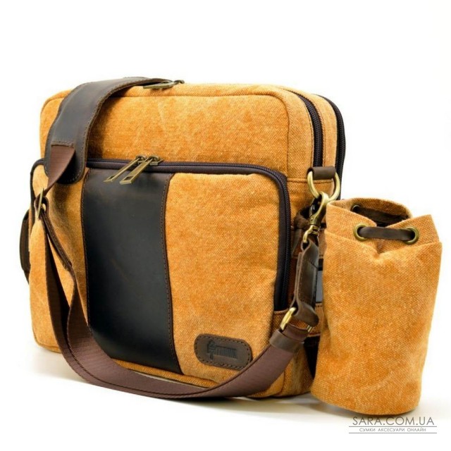 Унікальна сумка з парусини з шкіряними елементами RY-1092-4lx від українського бренду TARWA. Дуже стильний аксесуар для чоловіків і жінок на кожен день! Модель для повсякденного носіння виготовлена в комбінації тканини парусини (канвас) і натуральної шкіри Crazy Horse, що надає виробу особливий стиль. Лицьова сторона аксесуара прикрашена шкіряною смугою і брендом виробника. Також варто відзначити, наявність знімного утримувача під термо-чашку або маленьку пляшку з водою, який кріпиться збоку на торці сумки. З іншого боку є виступаючий кишеню для маленького телефону, окулярів або ключів. Велика зовнішня відкидний кишеню відрізняється своєю функціональністю - безліч кишеньок під пластикові карти, візитки та інші дрібні предмети. Виріб складається з двох відділень, застібаються на окремі блискавки. В основному, більшому по-розміром відділенні, розташовується ущільнений відсік з липучкою під планшет. В іншому - є врізна кишеня з блискавкою. Сумка оснащена текстильним ремінцем зі шкіряним наплічником для носіння через плече.