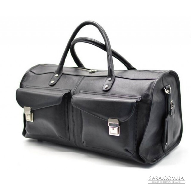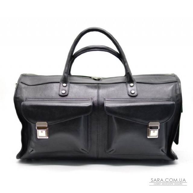 Красива і стильна, велика, містка дорожня сумка саквояж від бренду TARWA. Виріб виконаний з високоякісних матеріалів: теляча шкіра, щільна текстильна підкладка, металева фурнітура. Сумки даного виробника належать до "вищої ліги" шкіряних дорожніх аксесуарів. Такий дорожній аксесуар буде довго і вірно служити своєму власникові. Сумка має одне містке відділення, закривається на блискавку з двома бігунками. Усередині вироби є два великих кишені для документів, на одній стороні, і три маленьких кишені для канцелярії і телефонів, на іншій стороні сумки. Всередині на торцях по обидва боки є місткі кишені на блискавці, в них зручно зберігати цінні речі. Ущільнене дно захищено від пошкоджень п'ятьма металевими ніжками. Лицьову сторону аксесуара прикрашають дві накладних кишені з клапанами і замочками. На задній стороні є кишеня на блискавці. Класичний лаконічний дизайн. Дві укріплені міцні шкіряні ручки, для зручного носіння в руках. У комплекті є знімний шкіряний ремінь з текстильної основою, для носіння через плече. Найвища якість ручного пошиття сумки. Виріб доступний до замовлення в чорному і коричневому кольорах. Також є відеоогляд моделі в коричневому кольорі: