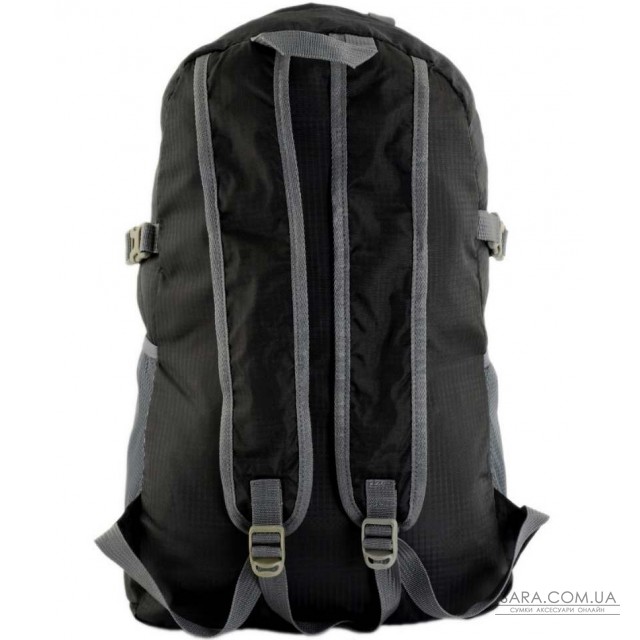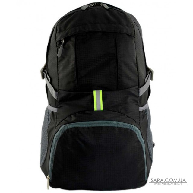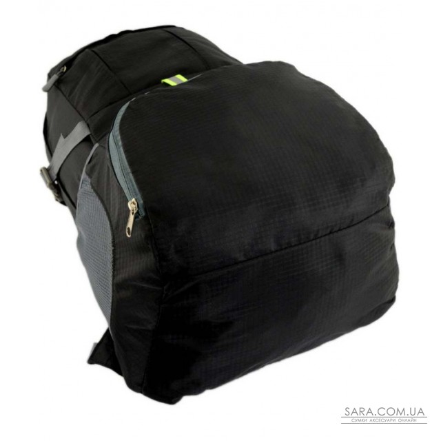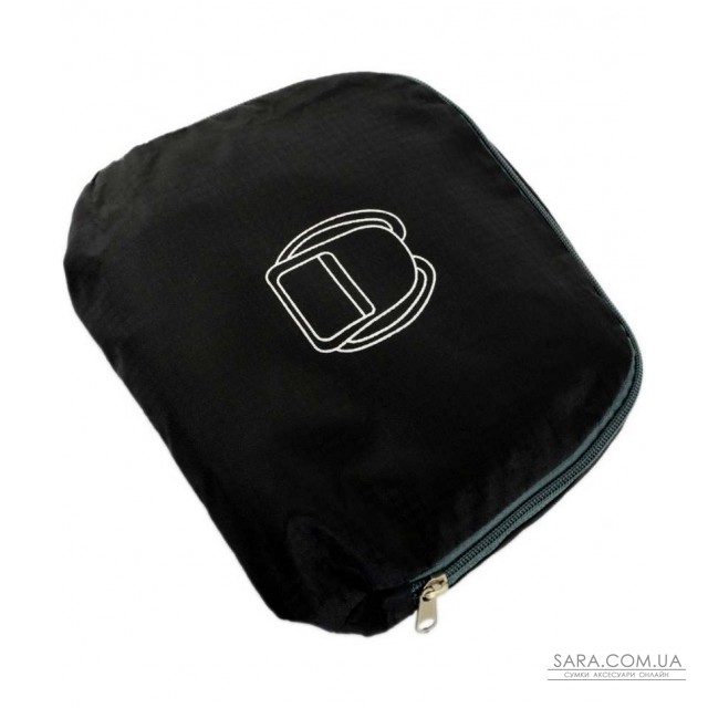 Складаний рюкзак з щільної непромокаючої тканини, чорного кольору. На блискавці, всередині - 1 кишеня. З лицьової сторони - 2 кишені на блискавці; бічні сітчасті кишені на резинці. Регульовані плечові лямки.