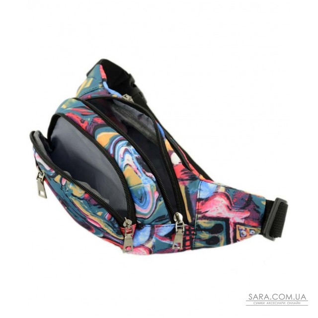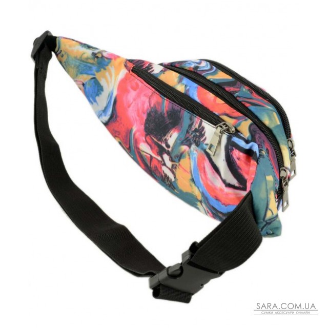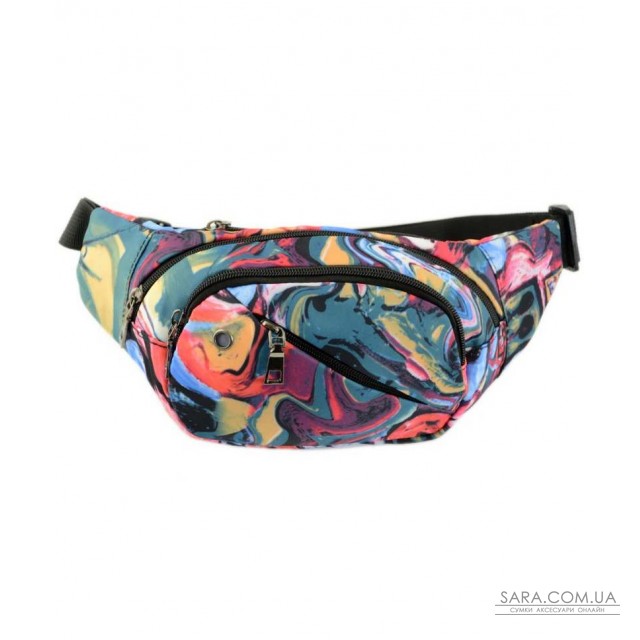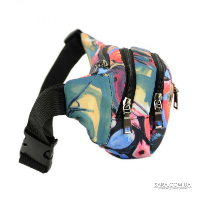Сумка на пояс з різнобарвним малюнком. 2 відділення на блискавці. З лицьової сторони - 2 кишені на блискавці, 1 - з виходом для навушників. Регульований корсажний ремінь.