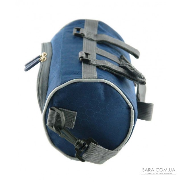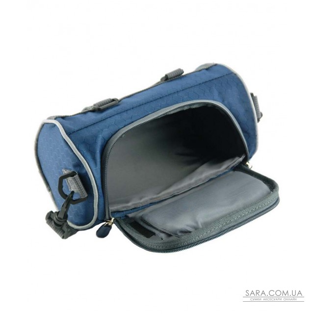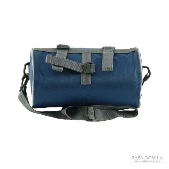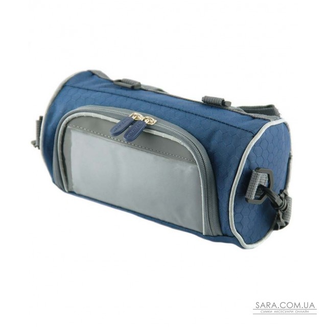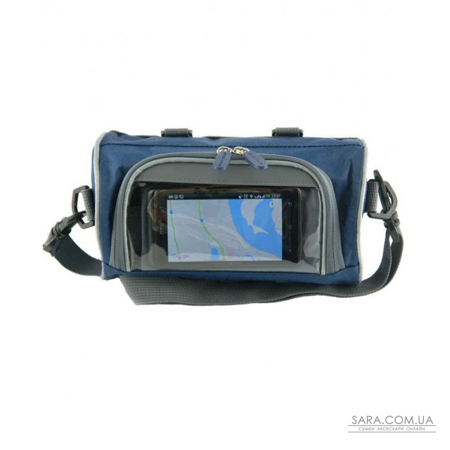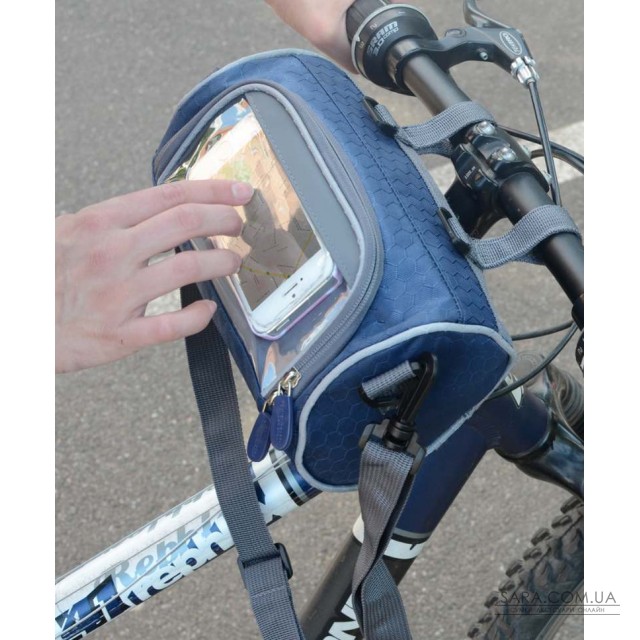Сумка-велобагажник з прозорим кишенею для смартфона, синього кольору. Кріпиться до керма велосипеда. Пристібається регульований плечовий ремінь.