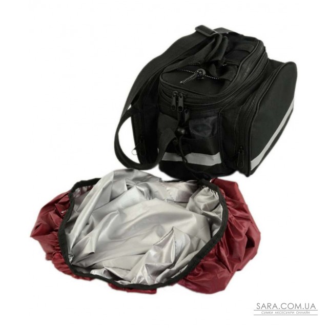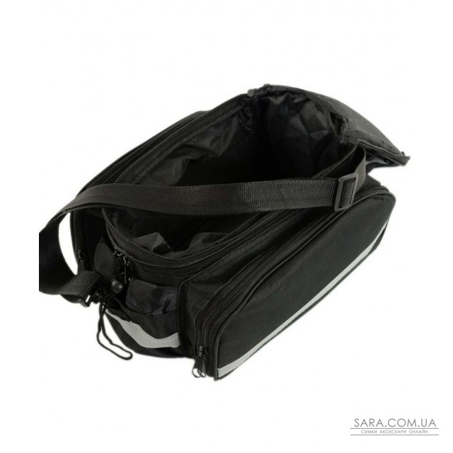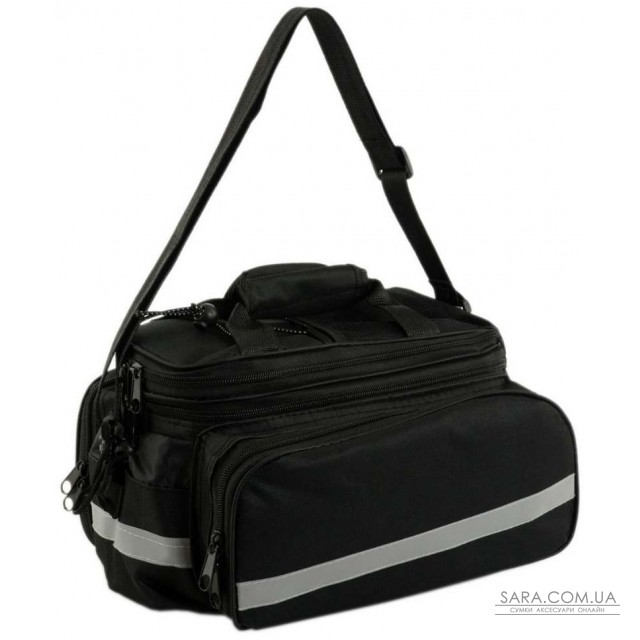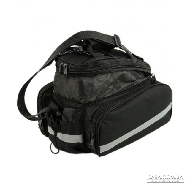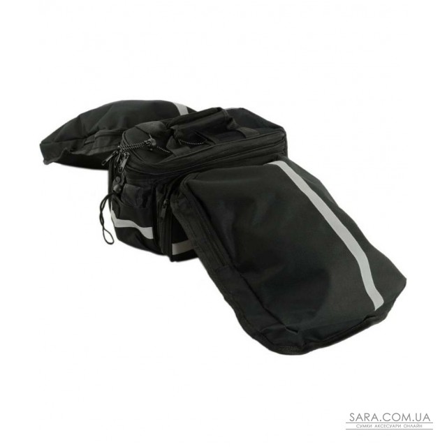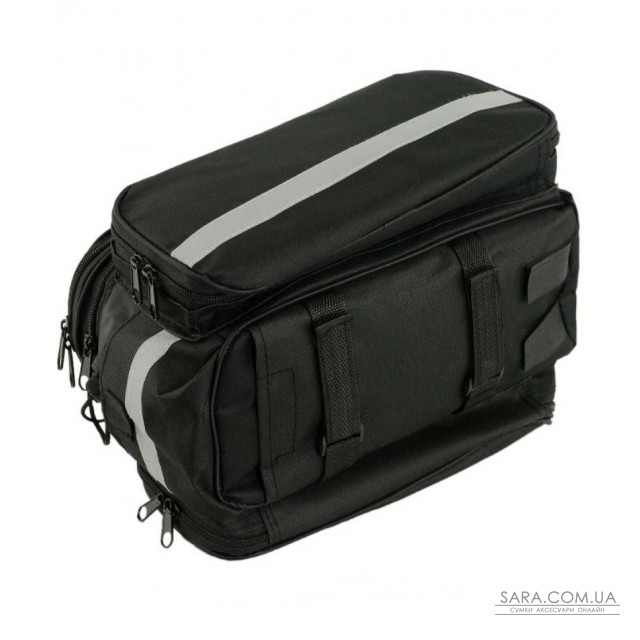 Сумка-багажник для велосипеда чорного кольору. Має 5 відділень на блискавці; сітковий і бічної кишені з фіксатором. Багажник кріпиться на задню раму. В комплекті чохол від дощу і знімний плечовий ремінь; короткі ручки.