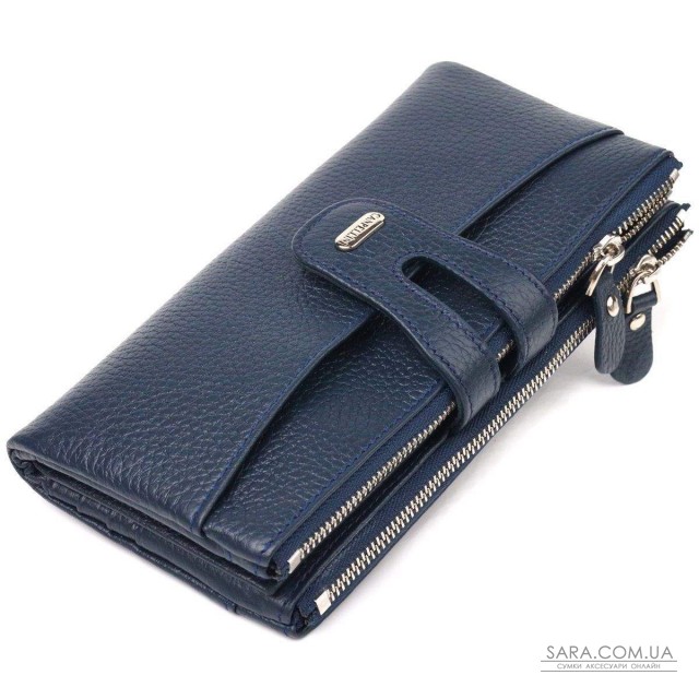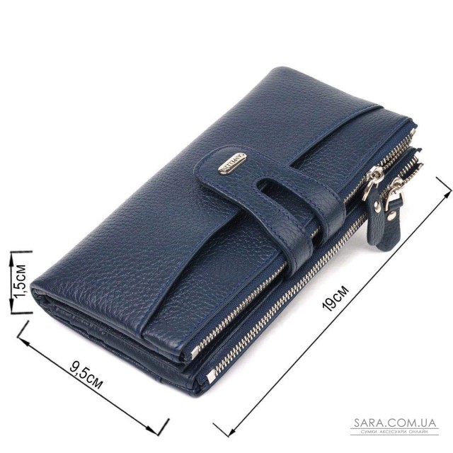 Практичний жіночий гаманець із натуральної зернистої шкіри. Аксесуар має два широкі основні відділення, в які поміщаються купюри всіх номіналів, дві монетниці, двадцять чотири кишені для карток, дві відкриті кишені зовні та одне прозоре віконце для документів. Закривається аксесуар хлястиком на кнопку. Якщо Ви хочете порадувати себе та здивувати близьких, то неодмінно купуйте шкіряні аксесуари в нашому магазині, якість і ціна Вас однозначно порадує.