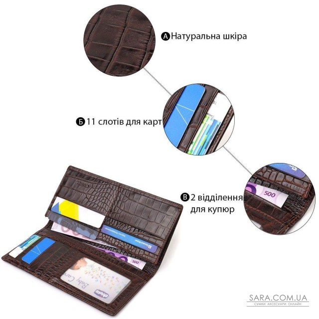 Цікавий чоловічий гаманець із натуральної шкіри з тисненням під крокодила. Аксесуар має одне основне відділення для купюр усіх номіналів, одинадцять осередків для карток, кишеню під сіточкою для пропуску, дві приховані кишені та монетницю на блискавці. Закривається аксесуар навпіл без застібки. На лицьовій стороні, у правому нижньому куті металевий логотип компанії виробника. Купуючи шкіряний аксесуар цієї фірми, собі або на подарунок, будьте певні, що він прослужить Вам не один рік.