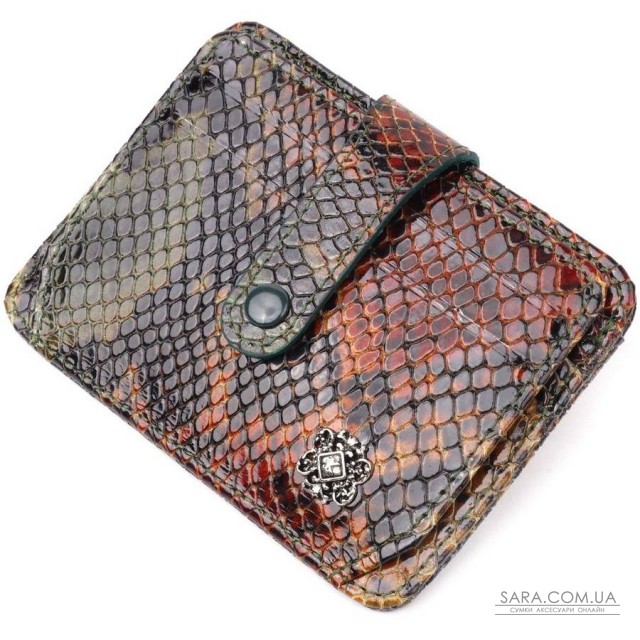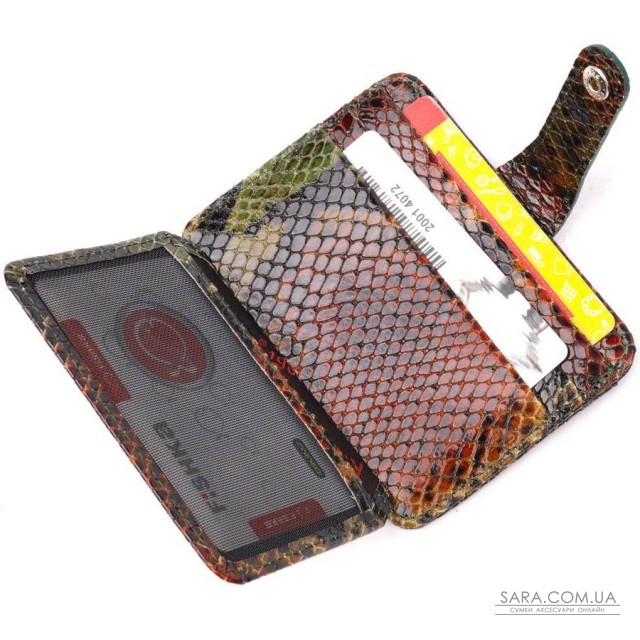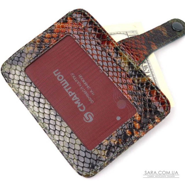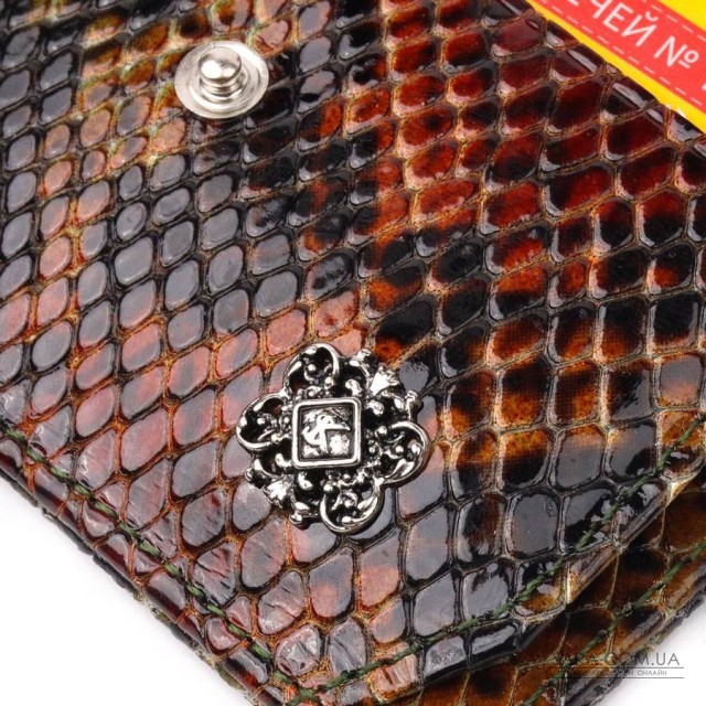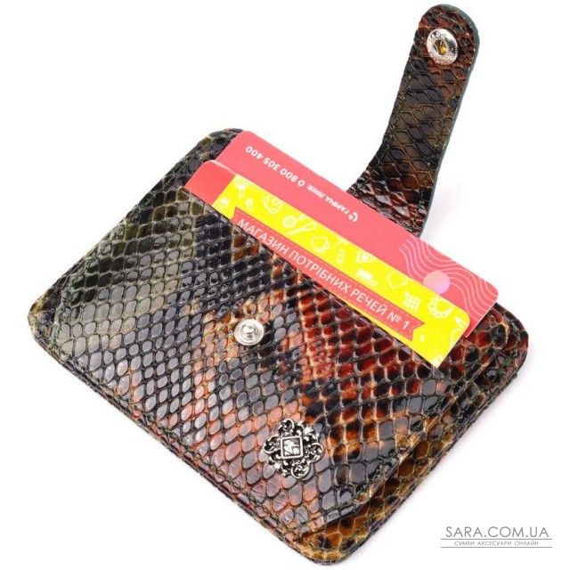 Незвичайний картхолдер із лакованої шкіри з тисненням під рептилію. При закритті розворот фіксується на хлястик з кнопкою. На лицьовій стороні у вигляді декору розташований металевий логотип виробника. Аксесуар упакований у фірмову коробочку. Вироби з натуральної шкіри завжди будуть чудовим подарунком для близької людини.