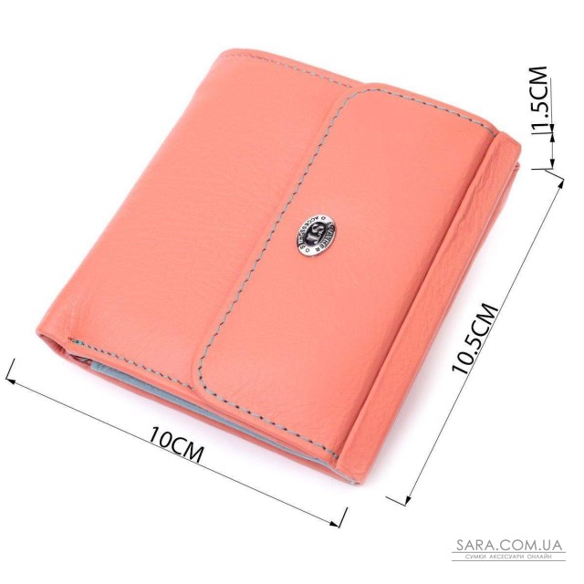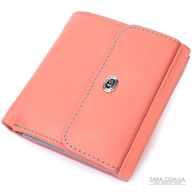 Неординарне кольорове портмоне для жінок середнього розміру із натуральної шкіри найвищої якості. Акцентом цього гаманця є колір, точніше кілька кольорів – він помаранчевого кольору зовні та багатобарвний усередині. Аксесуар складається з двох містких відділень для купюр, кишені на блискавці, чотирьох осередків для карт, прихованої кишені, прозорої кишені та кишені для монет. Зовні виріб прошитий рівним рядком бірюзового кольору по краю і прикрашений металевим логотипом компанії виробника, який розміщений вгорі посередині. Портмоне доповнено надійною фурнітурою та міцною підкладкою. Укомплектований гаманець у фірмову картонну коробку білого кольору.